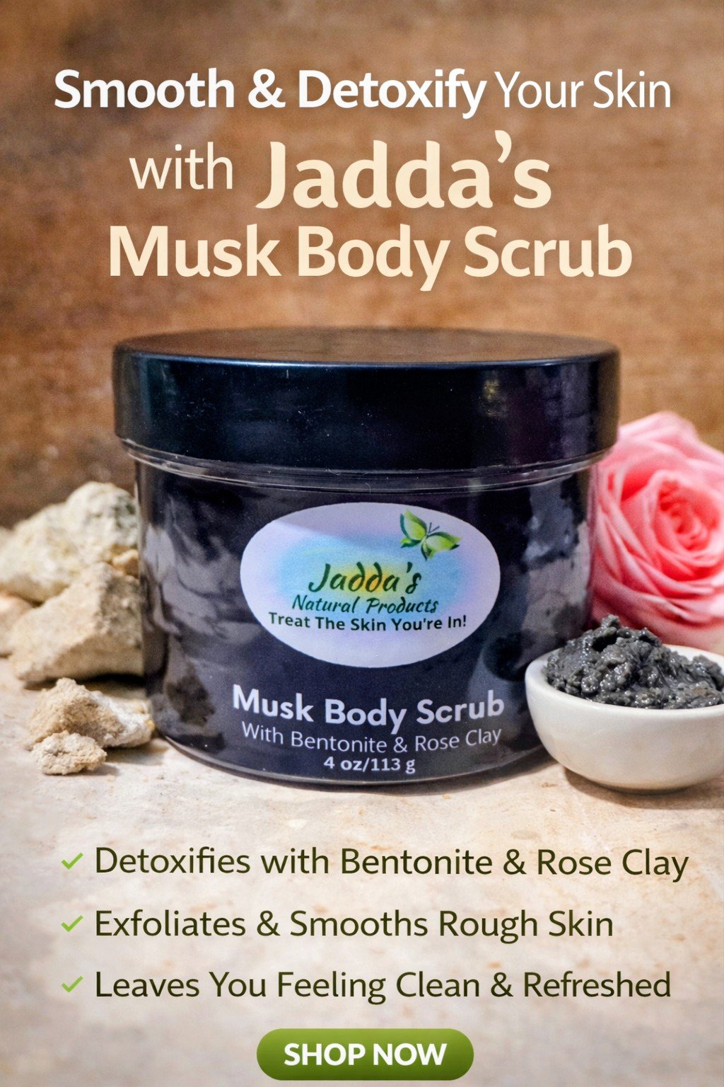 This unique formula goes beyond exfoliation — Jojoba oil deeply hydrates your skin, enveloping it in silky softness that lasts all day. Combined with rose clay, which brightens and detoxifies, and bentonite clay, known for drawing out impurities and excess oil, this scrub provides a comprehensive skin-renewal experience. Whether you have sensitive, dry, or oily skin, these carefully blended ingredients deliver results you can see and feel.